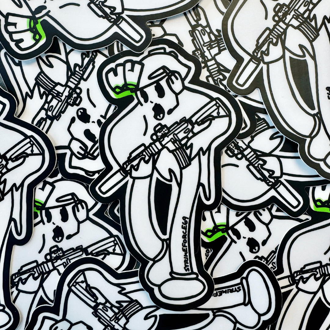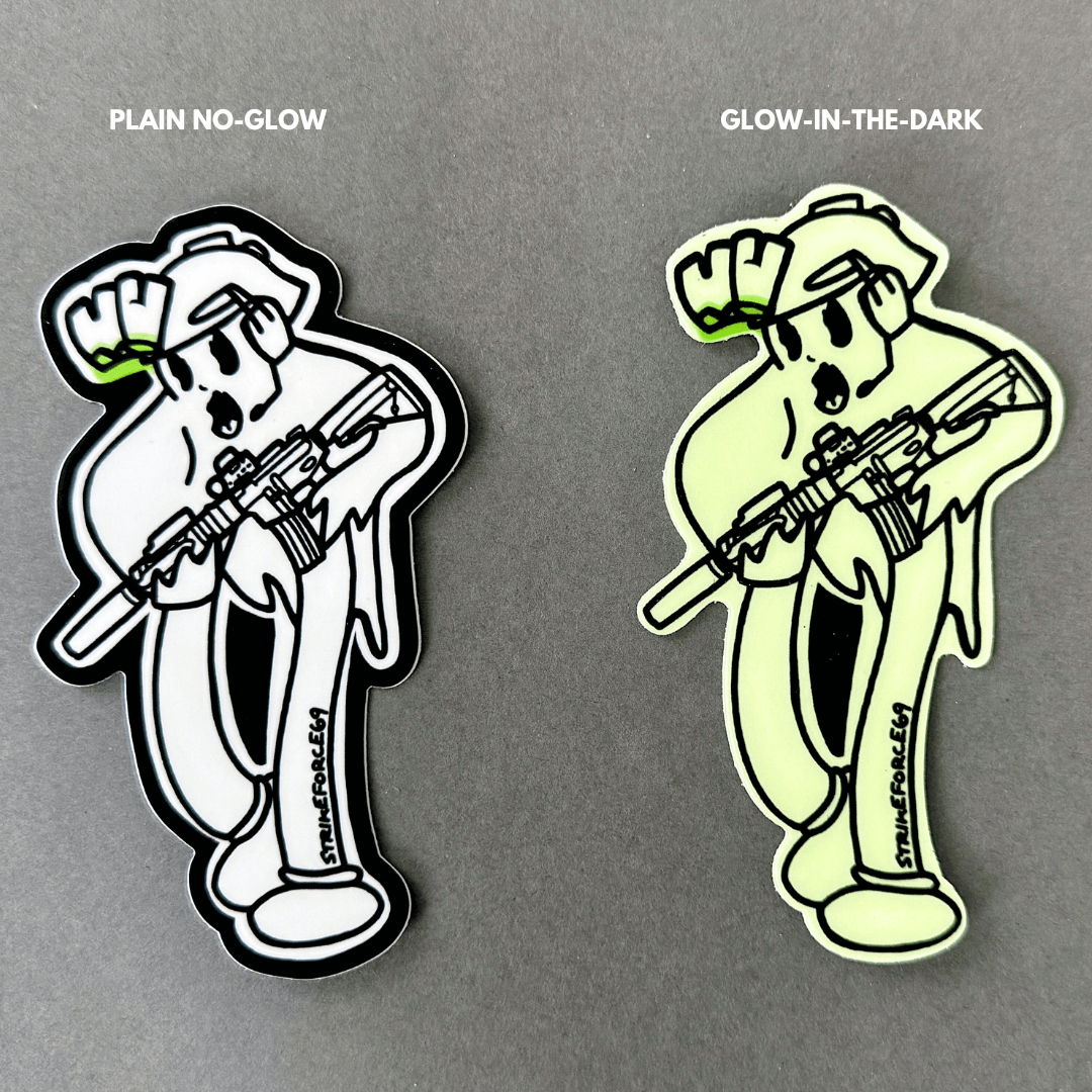 BooPatrol Tactical Ghost NVG stickers come in two variations: Glow-in-the-Dark or plain. Our tactical stickers are perfect for your gun safe, gun case, ammo cans, rifle mags, truck, laptop, workbench, water bottle, surfboard, skateboard, helmet, or any other suitable surface for a sticker. Showcase your rad taste.