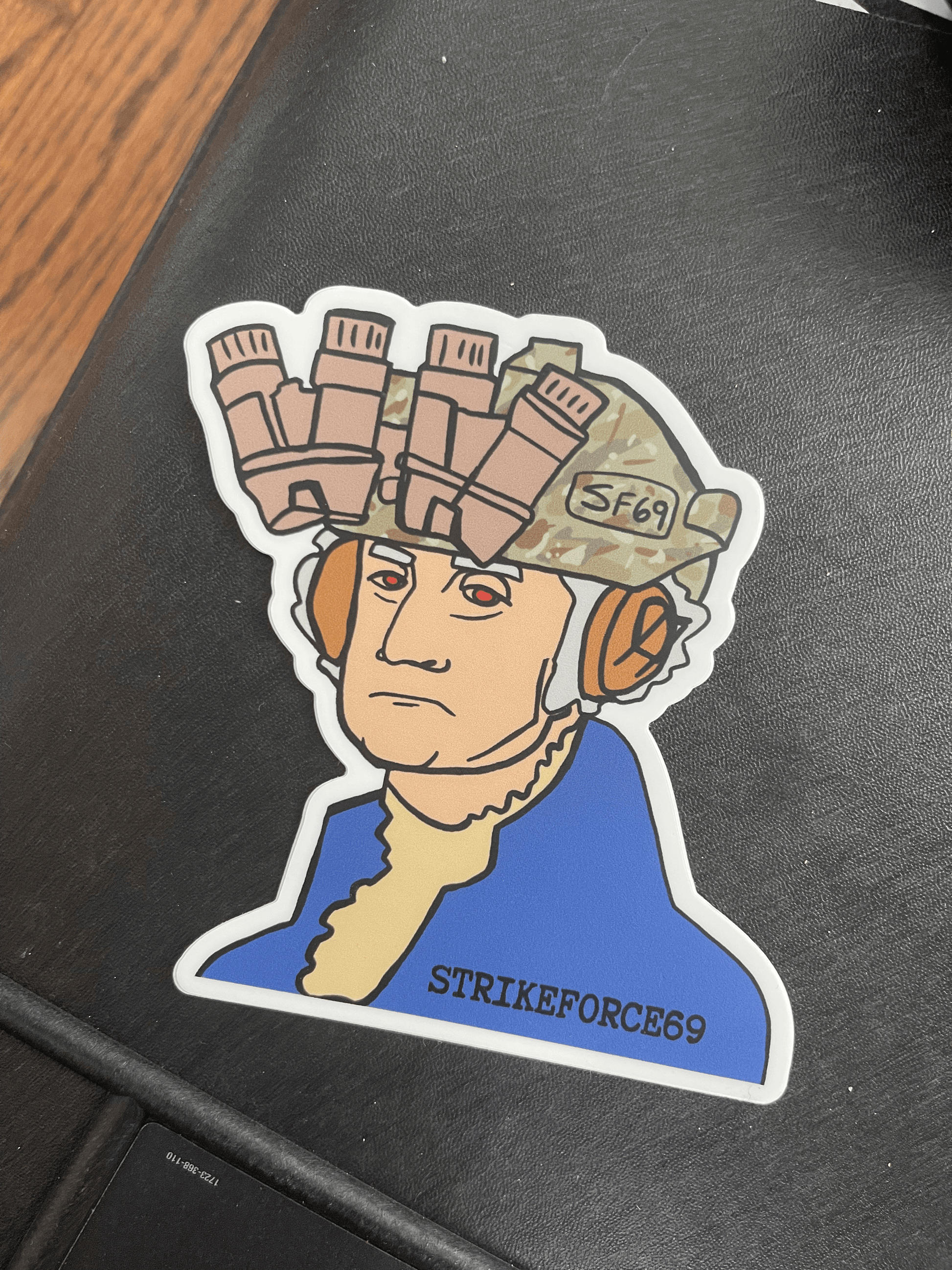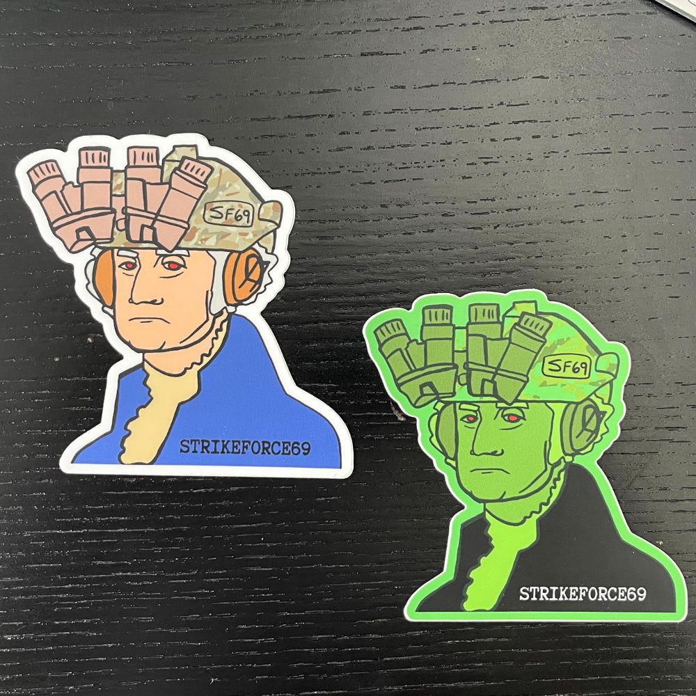Die Cut Tactical George Sticker in the Night Vision ON/OFF variation. Our tactical stickers are perfect for your gun safe, gun case, ammo cans, rifle mags, truck, laptop, workbench, water bottle, or any other suitable surface for a sticker. Showcase your rad taste.
