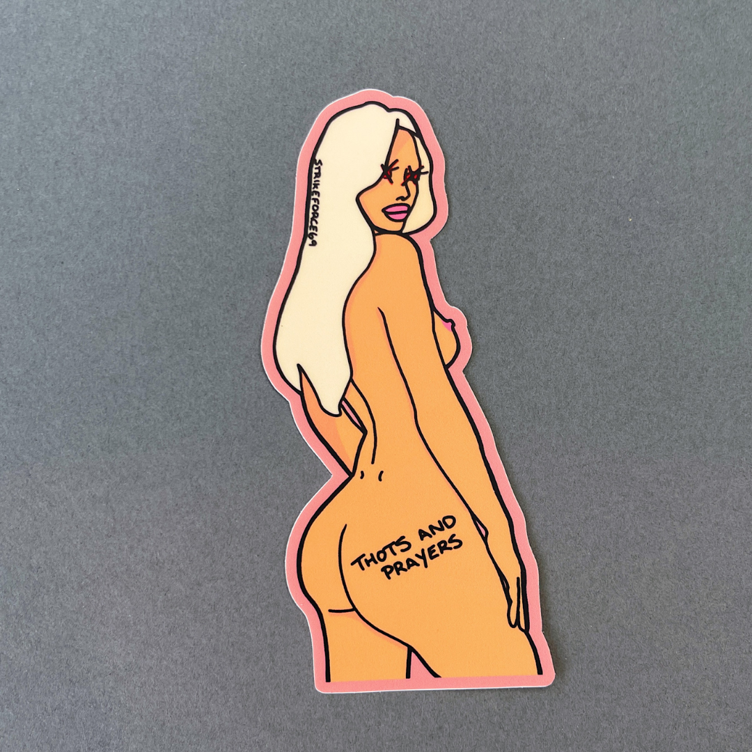 Beautiful tanned model sending her thoughts & prayers. Our tactical stickers are perfect for your gun safe, gun case, ammo cans, rifle mags, truck, laptop, workbench, water bottle, surfboard, skateboard, helmet, or any other suitable surface for a sticker. Showcase your rad taste.